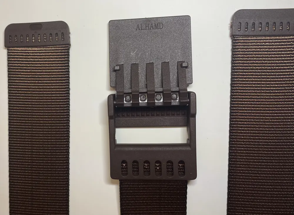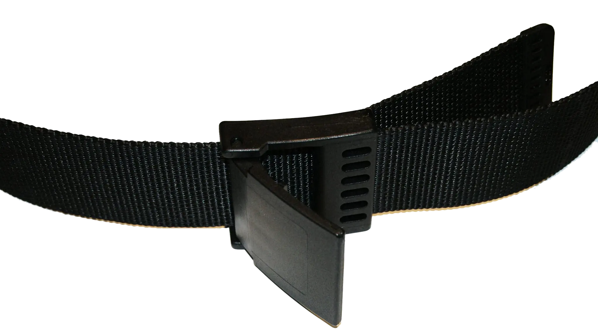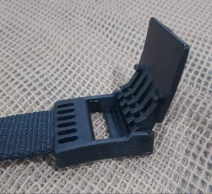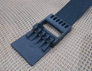 The buckle is of polyamide-6 resin, directly injected onto the fabric, thus enabling the webbing and buckle to form an exceptionally strong unit.